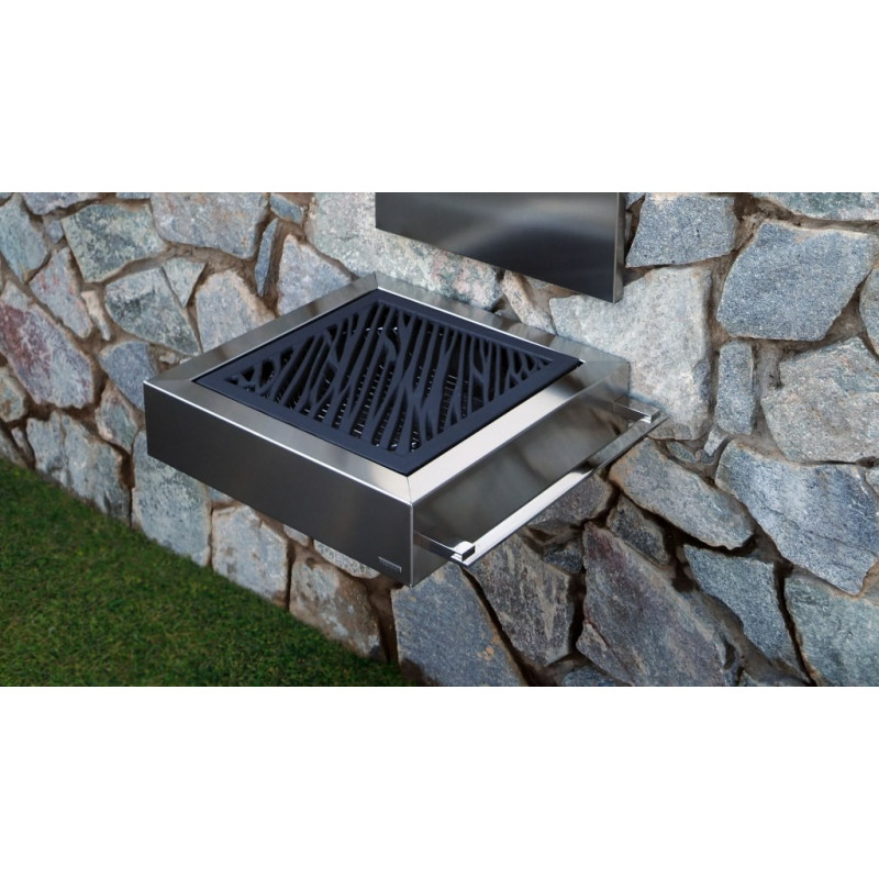 Asado-Holzkohleschale Fuego Holzkohlenschale Edelstahl. Buschbeck Toscana Masonry Barbecue. Dimensions : H2x L1x Pcm. Tablier en cuivre sur plan de travail.